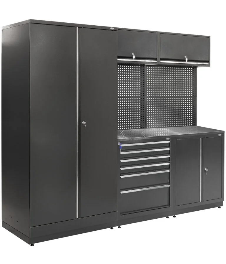 Modulinė metalinė garažo sistema – tai itin patvari ir funkcionali įrankių laikymo bei darbo erdvės organizavimo sistema, skirta garažams, dirbtuvėms ir serviso patalpoms. Pagaminta iš aukštos kokybės plieno, ši sistema užtikrina ilgalaikį naudojimą ir puikią daiktų priežiūrą.