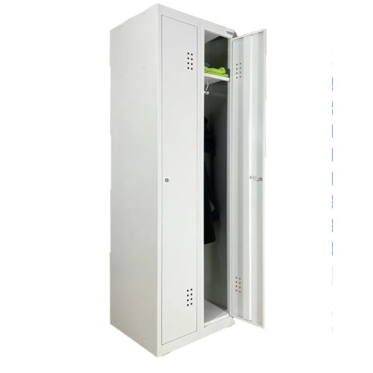 Metalinė persirengimo spintelė SO-500/2 pagaminta iš storasienio 0,8mm lakštinio plieno ir nudažyta korozijai atsparia milteline emale, pilka spalva (RAL 7035). Tvirta ir patikima korpuso ir durelių konstrukcija. Durelės suvirintos konstrukcijos ir papildomai sustiprintos standumo briaunomis. Unikalaus dizaino ventiliacinės angos durelių viršuje ir apačioje. Sumontuoti guminiai amortizatoriai tyliam durelių uždarymui. Guminiai padeliai po spintos cokoliu. Centrinis užraktas (2 raktai). Kiekvienas spintelės skyrius turi lentynėlę ir skersinį pakaboms.