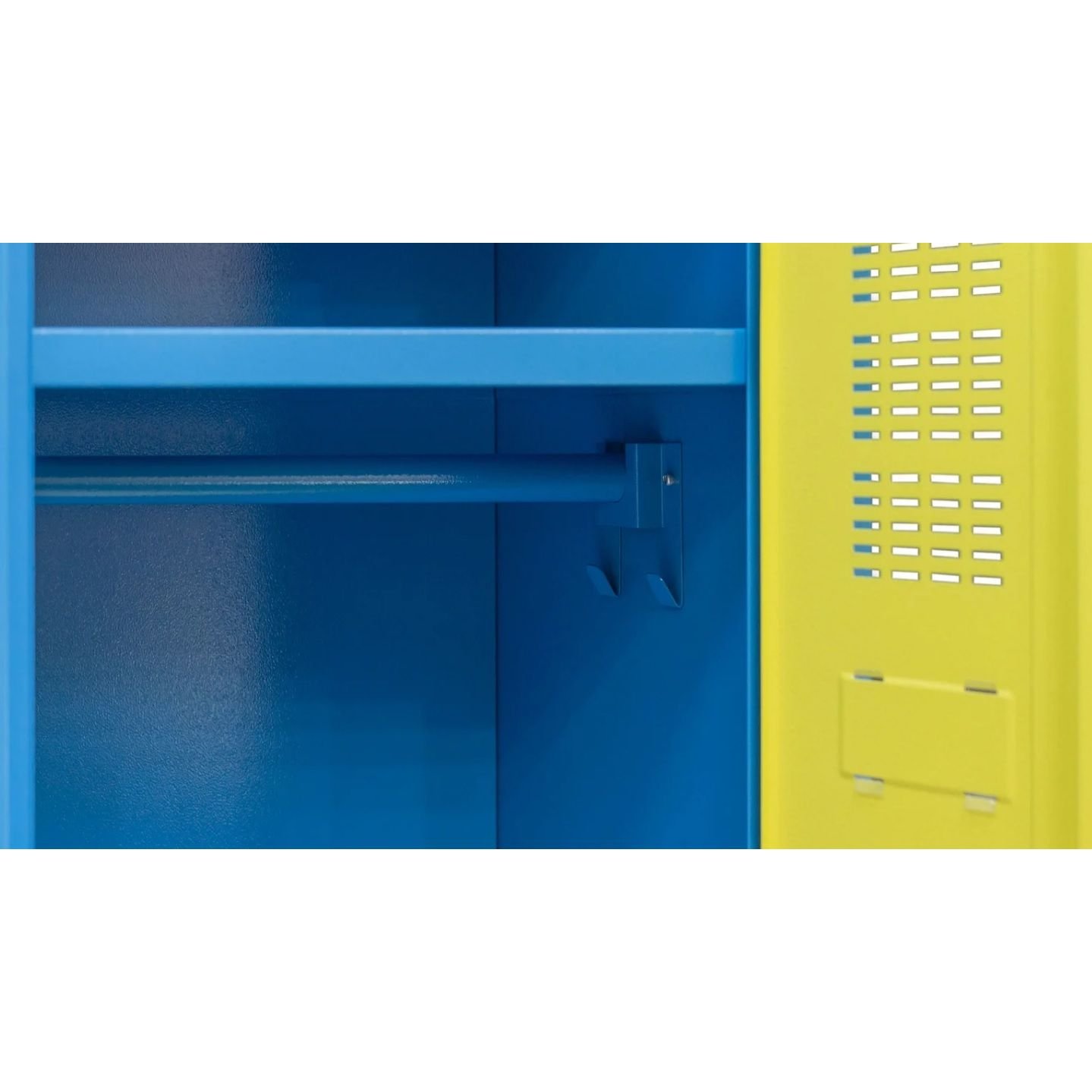 Kiekvienas spintelės skyrius turi lentynėlę daiktams bei batams ir skersinį pakaboms.